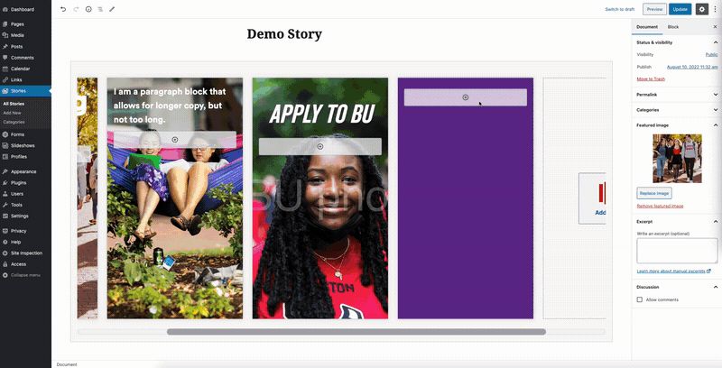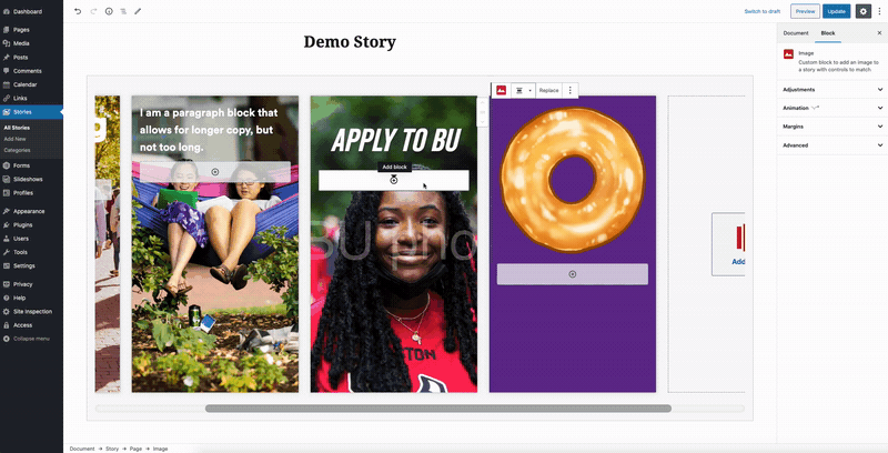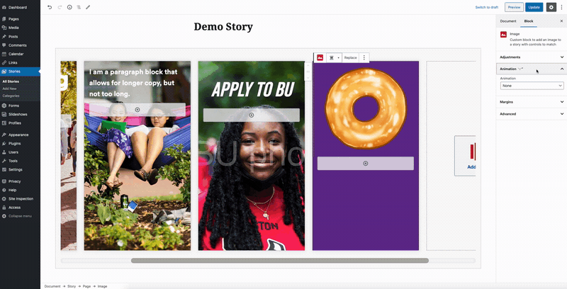 The Image block should be used for adding visual interest to stories, whether inserting images or animated gifs. You can find more detail about customization options below.