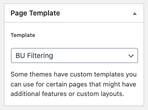 To select the “BU Filtering” page template, go to the Pages menu in the left navigation bar of WordPress, find the page you want to change, and select Edit